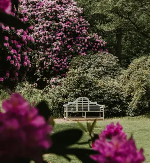 Med inspiration från engelska naturparker bjuder trädgården på mjuka former, slingrande gångar och rhododendronbuskar som formar gröna tunnlar.