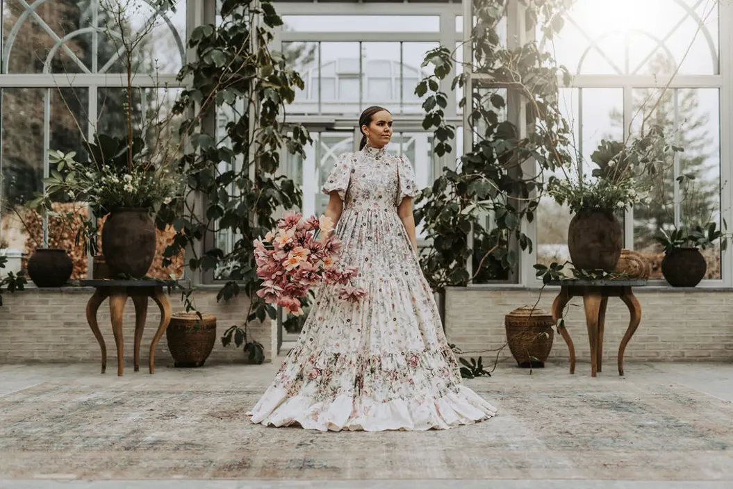 De magiska och blomstrande miljöerna är skapade av Norrvikens dekoratörer och runt Norrvikens bröllopsklänning har kreatören Anna Starrén vävt samman pappersblommor till en charmig och inspirerande miljö som förstärker klänningens budskap om återbruk, kreativitet och skönhet.