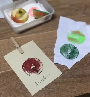 Prova på en kreativ tryckteknik där äpplen används som naturliga stämplar.