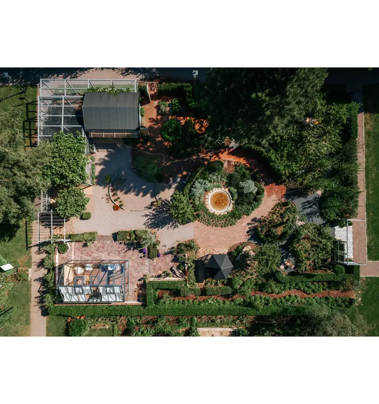 Här berättas också historier i det lilla: en slingrande stig leder till en grusad gårdsplan med låg rundel, en arbetshörna gömmer sig bakom blåregn och plank, och under trädkronorna i bersån lockar bänkar till vila och reflektion.