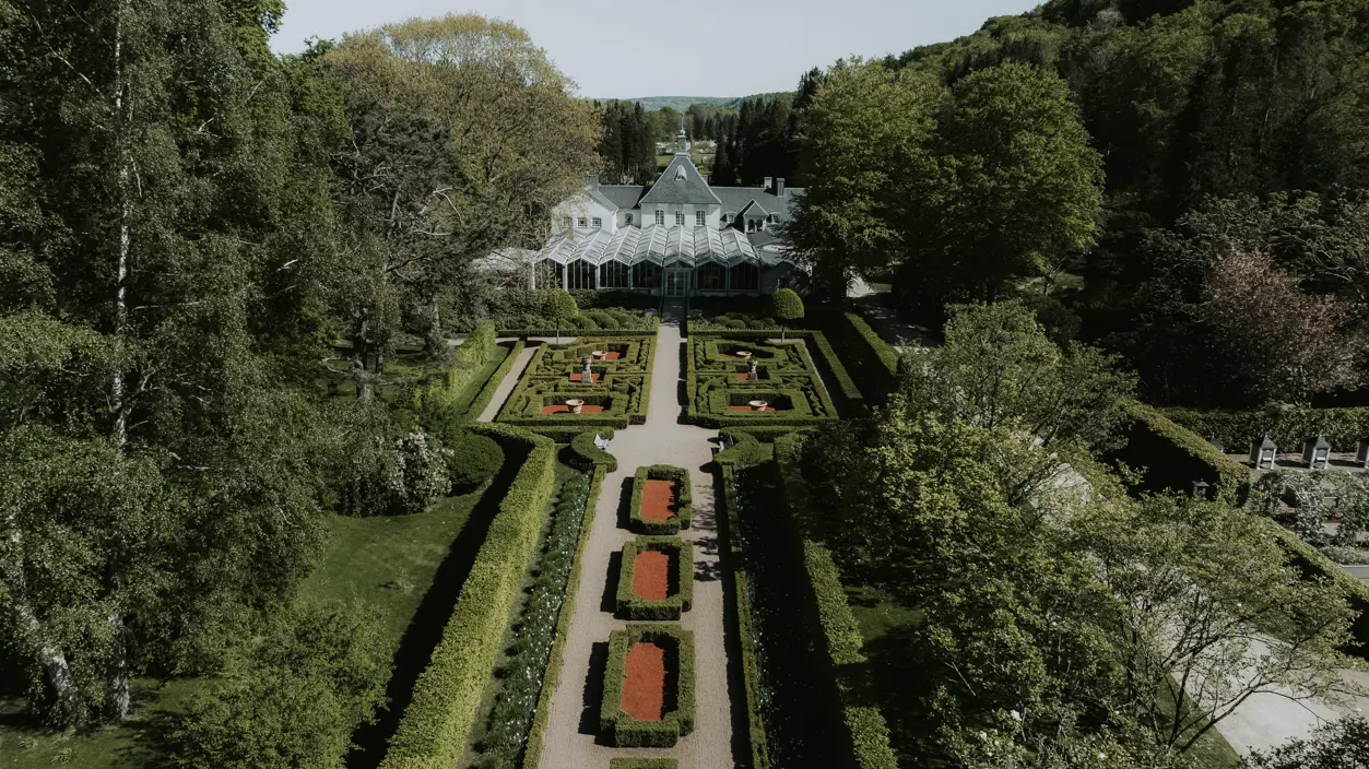 Broderiparterrer: Buxbomshäckar formade i sirligt broderimönster.