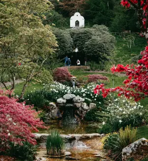 Små rennilar och dammar rinner genom sluttningen framför det vita vattentemplet. Den japanska blodlönnen och hortensiorna skapar dramatik och färgprakt.